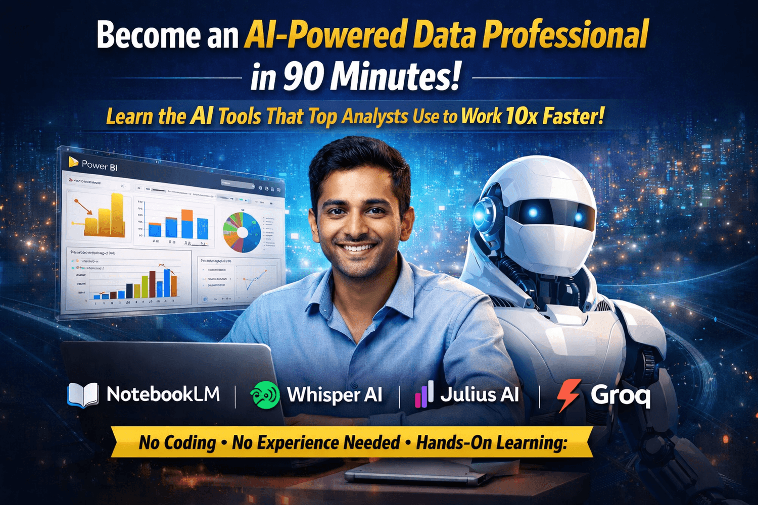 Learn how to use AI tools to analyze data, automate workflows, and build dashboards — in just 90 minutes live session (even if you’re a beginner)